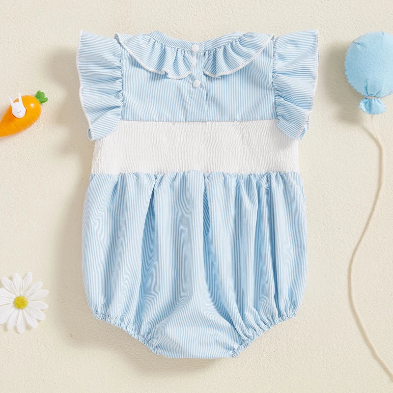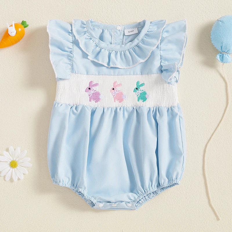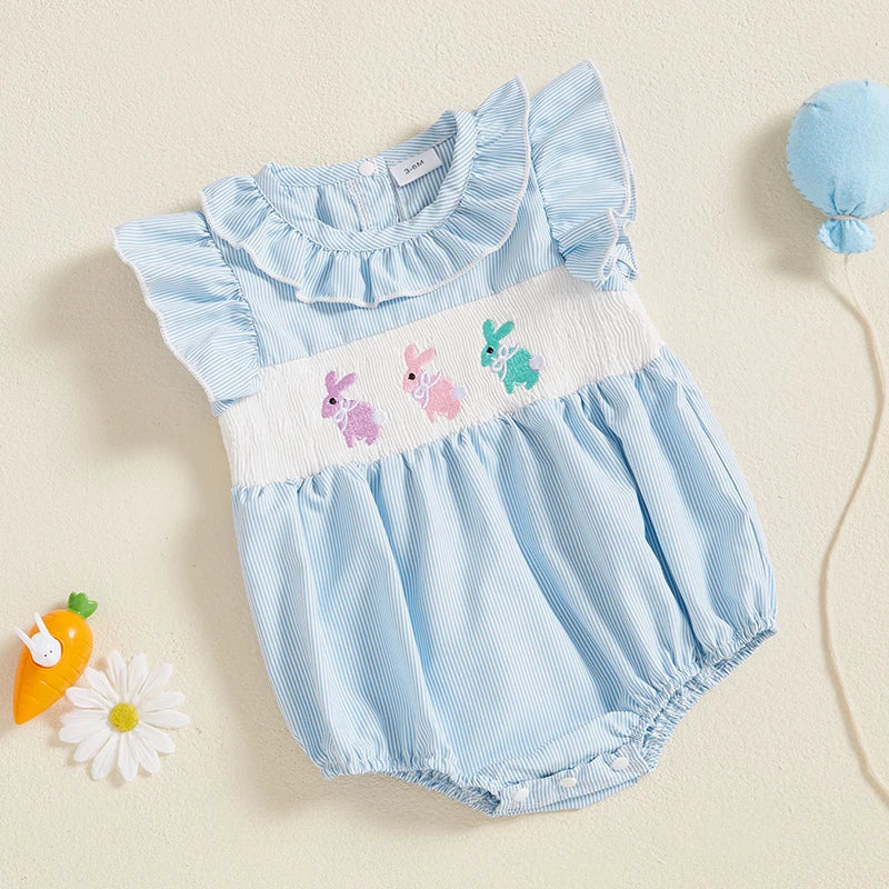 Easter Bunny Embroidered Romper with Ruffle Collar and Smocked Bodice - Adorable Short Sleeve Newborn Outfit for Baby Girl